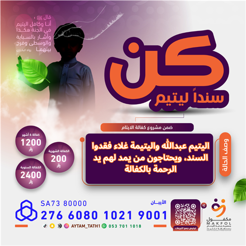 اليتيم عبدالله واليتيمة غلاء فقدوا السند، ويحتاجون من يمد لهم يد الرحمة بالكفالة